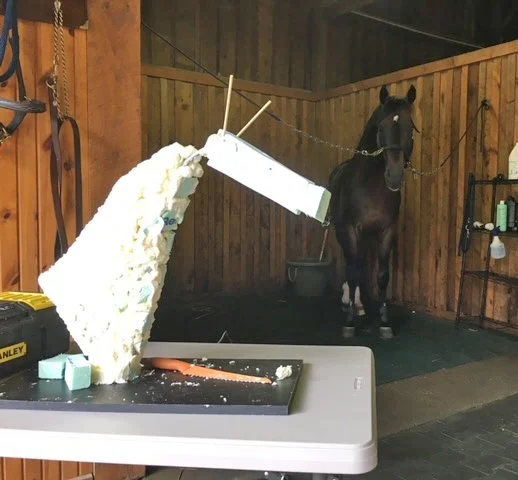 “When Cynthia asked me to do a portrait of her stallion, Orbetello, she mentioned how gorgeous he was, said King. That’s not always what the people say about their horses; often it’s their race or show record – or their love of their horse. Aesthetics was important to her. “Later, when I was standing in front of him, observing him, I thought, he’s one of the most physically commanding stallions I’ve ever seen. He seemed comfortable in his skin. Nothing fussy about him while he was cross-tied for several hours as I worked on his model.”